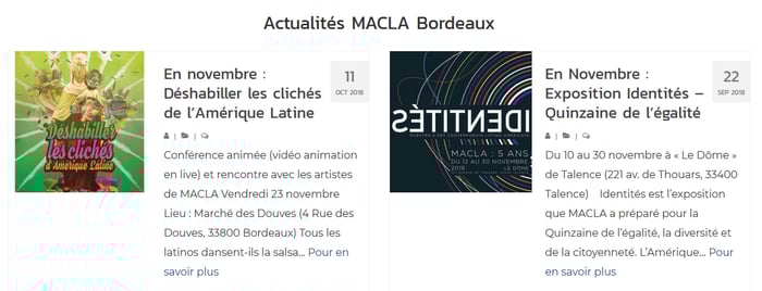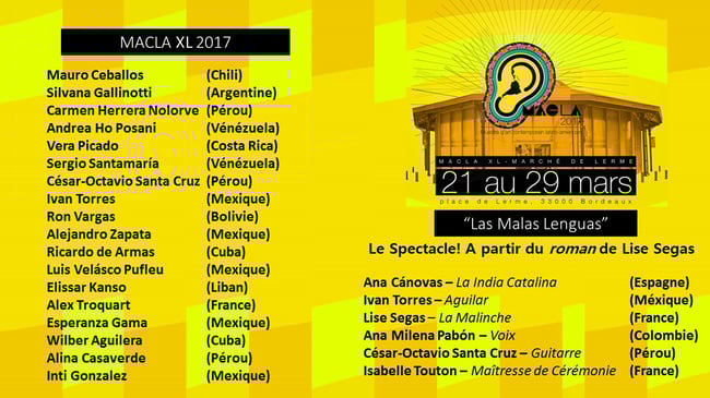 C’est l’institut Cervantès de Bordeaux qui accueil MACLA depuis 2014 pour 1 mois. En 2018, nous célébrons notre cinquième anniversaire. Pendant ces 5 ans de travail, de rencontres et de découvertes, MACLA s’est beaucoup transformée et le projet s’est élargi grâce au soutien de différents acteurs culturels mais aussi grâce à l’intérêt du public, de plus en plus nombreux. Néanmoins, au-delà des transformations, l'objectif reste toujours le même : MACLA veut dévoiler l'énorme force vitale et créatrice d'une Amérique latine aussi riche que diverse culturellement, loin des clichés à partir desquels s'est construite son image en France.